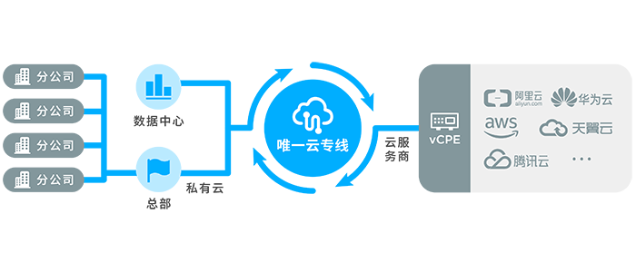 為客戶提供云下(辦公地點/數據中心)到云上(各大公有云)的透明傳輸通道,通過物理專線連接 和固定路由配置,獨占網絡鏈路,可避免數據泄露的風險,同時免去數據擁堵或故障繞行帶來的時延不穩的困擾。
