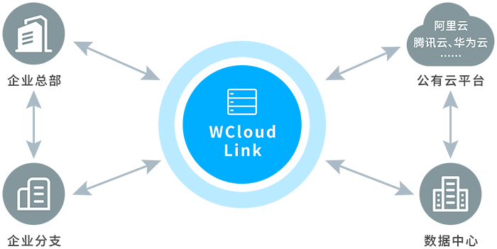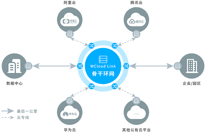 隨著業務發展,企業客戶需要多個區域混合云的部署方式。WCloud Link 傳輸骨干環網已對接阿里/騰訊/華為各大公有云節點城市端口,可為客戶提供便捷上云服務,同時借助自研云平臺、云管平臺以及多云生態,為客戶提供“多云”、“混合云”等一站式解決方案以及定制化服務。